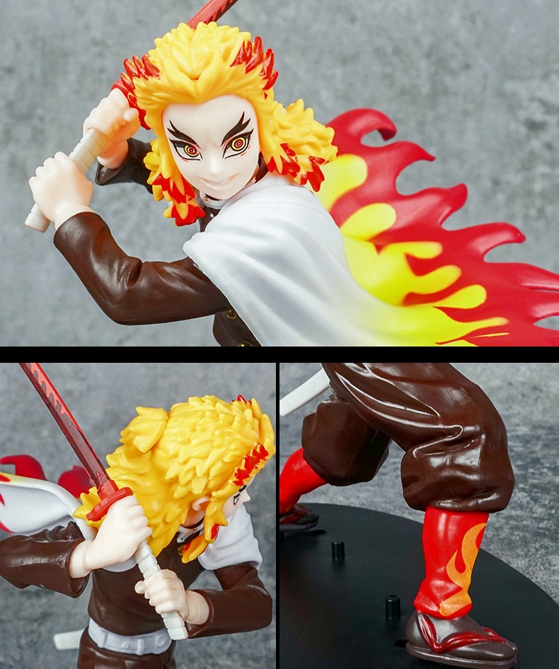 در این فیگور، رنگوکو در حالتی ایستاده نمایش داده شده که شمشیر نیکرین خود را در دست دارد. تیغه شمشیر با نقشهای آتشین و منحصر به فردش، نشاندهندهی ارتباط عمیق او با عنصر آتش است. موهای طلایی و قرمز او که همچون شعلهای سوزان است، به زیبایی طراحی شده و حس حرکت و انرژی را القا میکند. لباس سنتی او، کیمونو با حاشیههای قرمز و نارنجی، با دقت زیادی بازسازی شده است تا اصالت شخصیت حفظ شود.